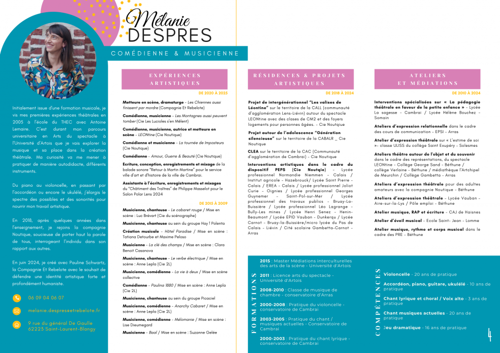 Depuis 2018, Mélanie Despres travaille comme comédienne, musicienne, metteuse en scène et autrice pour différentes compagnies des Hauts-de-France (Cie Les Lucioles s’en mêlent, Cie Noutique…).